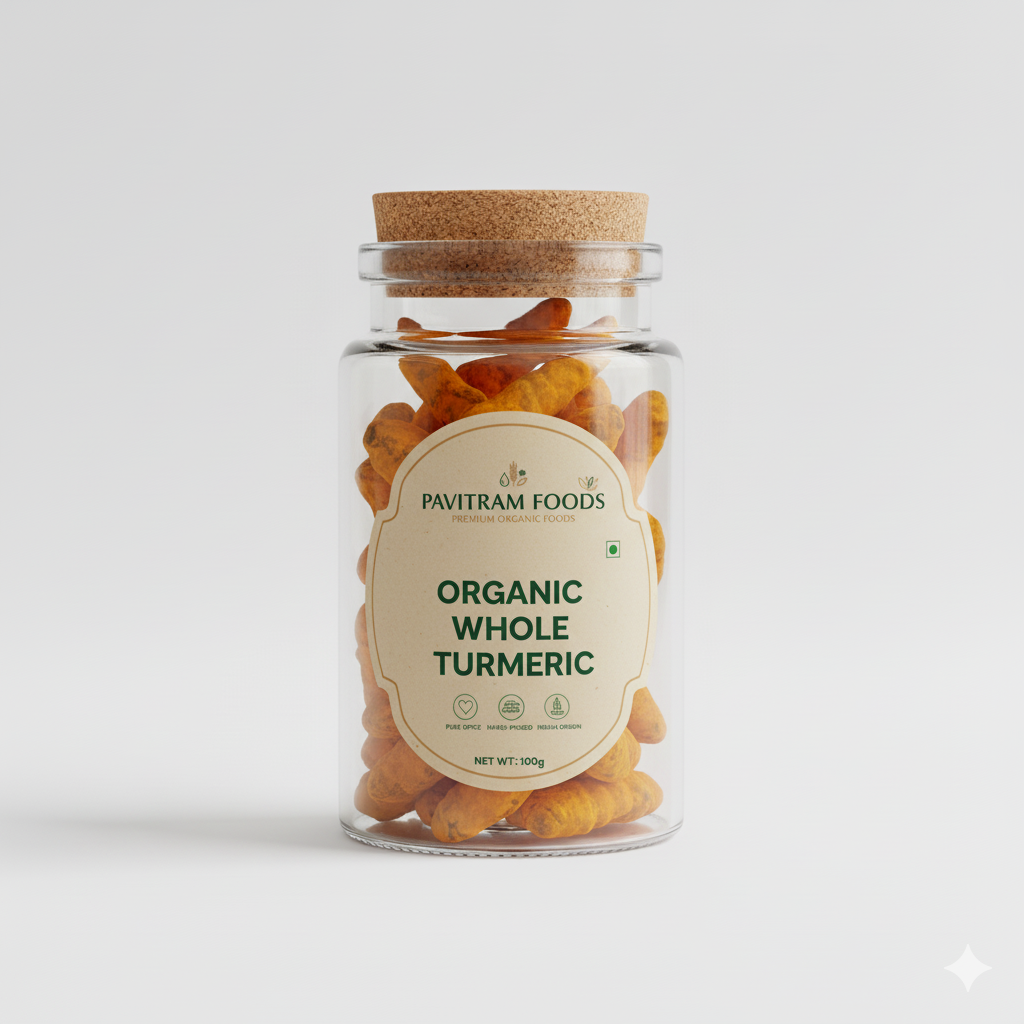 Pavitram Foods Organic Turmeric is hand-harvested and naturally processed to preserve its rich color, earthy aroma, and potent curcumin content. Free from chemicals and additives, it brings authentic flavor and powerful health benefits to your kitchen. A golden touch of purity and tradition in every spoonful.